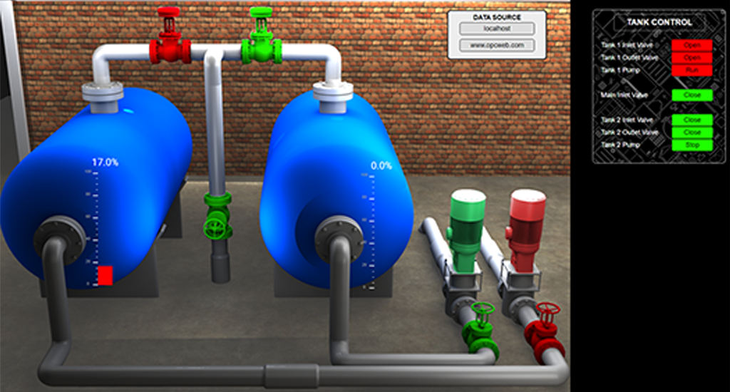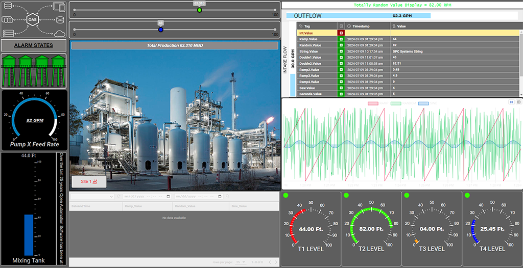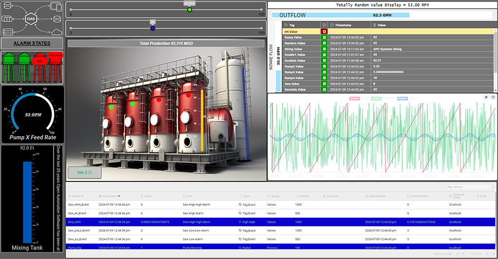 A collection of basic demo screens demonstrating several components of the UIEngine including dynamic images, symbols, trends, and alarms.