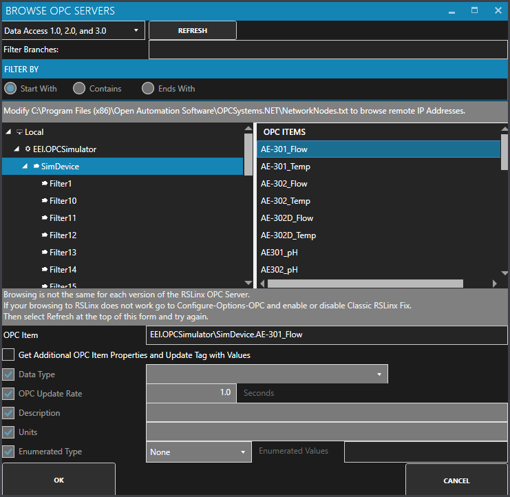 Note: If you wish to browse remote OPC servers via IP address see Networking OPC Data.