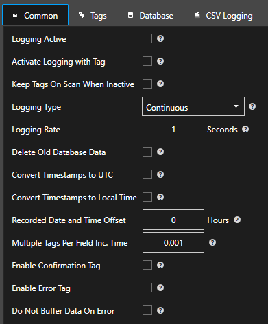 When enabled the Logging Active (see above) selection is controlled with the specified Tag and Parameter that is specified. When the value of the Tag Parameter is True the logging is set to Active, and when the value is False the logging is set to Inactive.