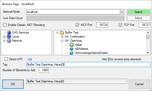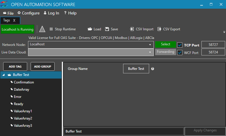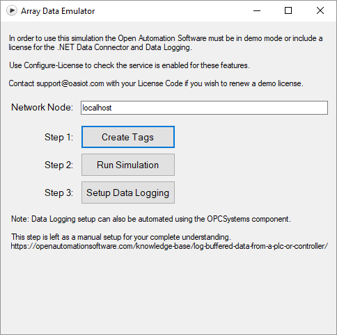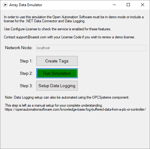 Note: The Array Data Emulator program you will need a license of the .NET Data Connector and Data Logging for an additional 4,007 Tags or in Demo Mode. If you need to test this feature on a production license and do not have these products contact our support team at support@oasiot.com.