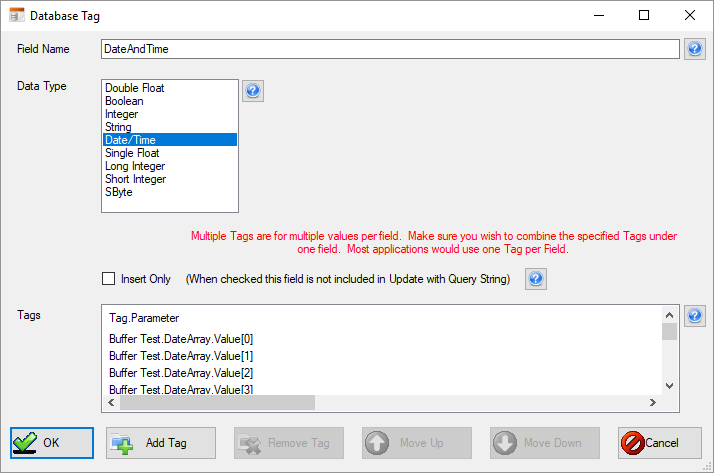Note: If you want to include timestamps for your date the time should come from the controller. All OAS Data Sources receive the timestamp with the value source, but in this Event Logging time the Date and Time come from the Trigger Tag value, not the array values in the controller.