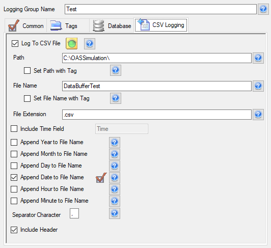 Important: Enable Data Buffer To Disk under Configure-Options-Data Buffering on all data source Tag servers and data logging servers to retain data on a network failure, database engine failure, or if Excel has a CSV file open as it locks it for exclusive use.