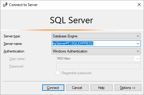 Also the login method can be with Windows Authentication or SQL Server mode. Contact your database administrator if you are unsure of what login type to use.