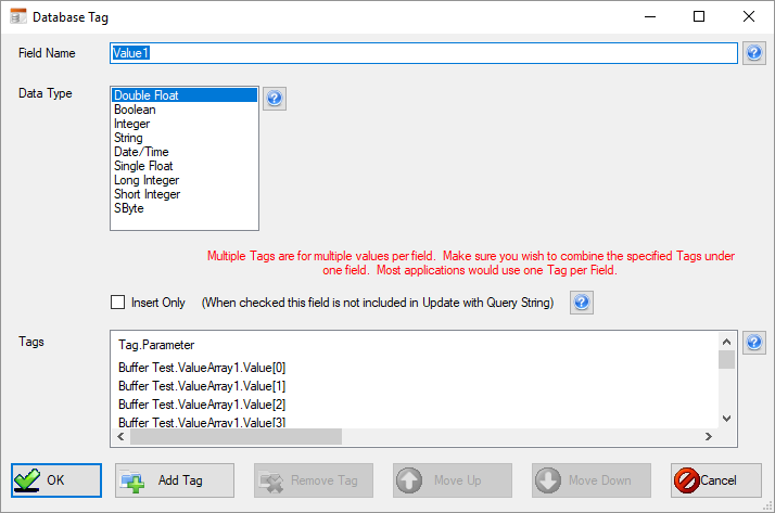 - Values: Arrays containing queued values to be logged. The data type of the array can be anything you desire including Double Float, Single Float, Long Integer, Integer, Short Integer, Boolean, or Strings.