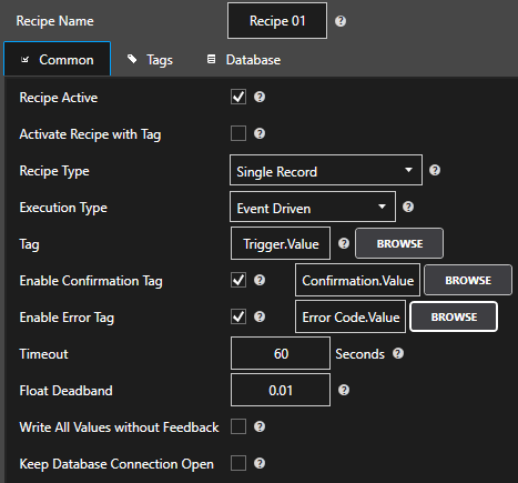 When enabled a Boolean Tag can be specified to receive an integer value with error codes to show what failure if any occurred. The specified Tag value will be set to 0 when Recipe first executes and will be set to a positive number if an error occurs.