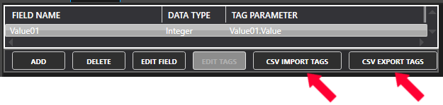 Add a data field and specify the Tag Parameter, field name, and field data type use the Add Button.
