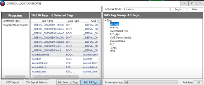 Select the AB Tags group from the Tags window on the right. Specify a Poll Rate if desired. Choose Add Selected Tags or Add All Tags.