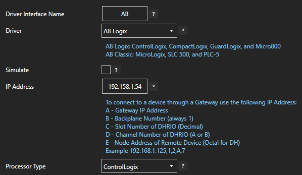 Enter a friendly name in the Driver Interface Name box. In the Driver drop down list, select AB Logix. Enter the IP address for your device in the IP Address box.