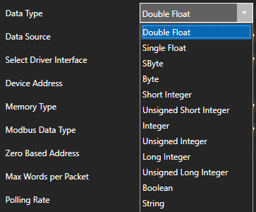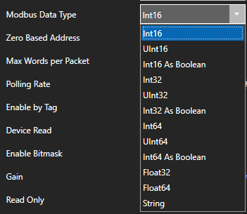 Note: If you are using Gain and Offset in a tag to scale an integer value to a floating point value use Double Float or Single Float as the Data Type.