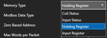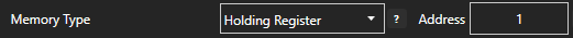 For example to access holding register 40,001 set the Memory Type to Holding Register and the Address to 1.