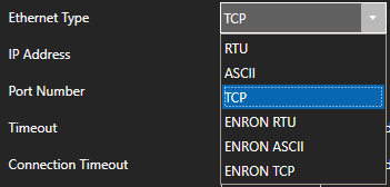 The protocol type can be set to TCP, RTU, or ASCII. Although OAS can support all 3 protocols on either Ethernet or Serial interfaces it is typical to use TCP over Ethernet and RTU or ASCII over Serial.