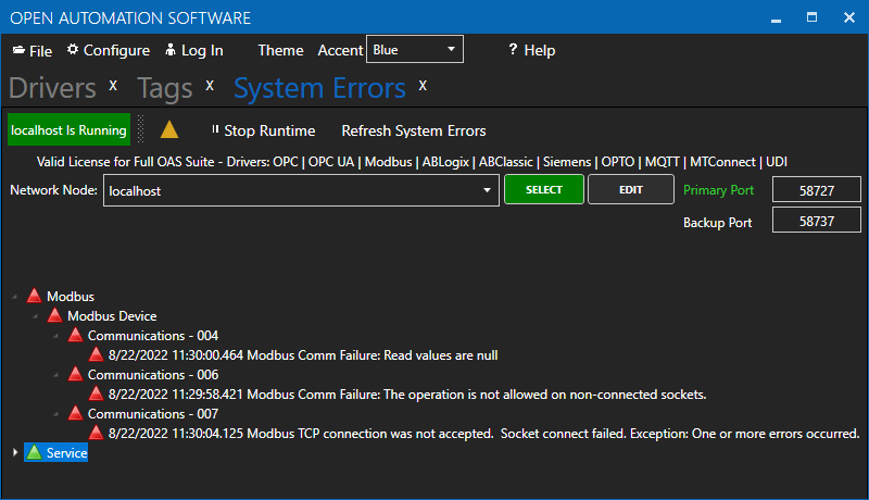 Select Configure-System Errors and expand any Modbus or Driver Interface error to see the details of the error.