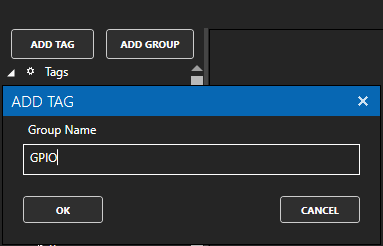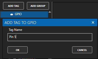 With the GPIO group selected click on ADD TAG to a tag with the name Pin 5. The tag name can be anything you desire. In this example we are assigning to GPIO Pin 5 so we will name it Pin 5.