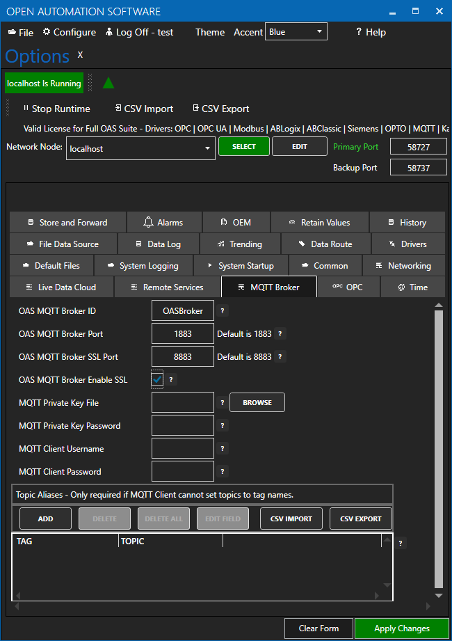 - Optionally enter Topic Aliases to map topic names to OAS tag names. This is only required if the MQTT client cannot define the topics to interface with.