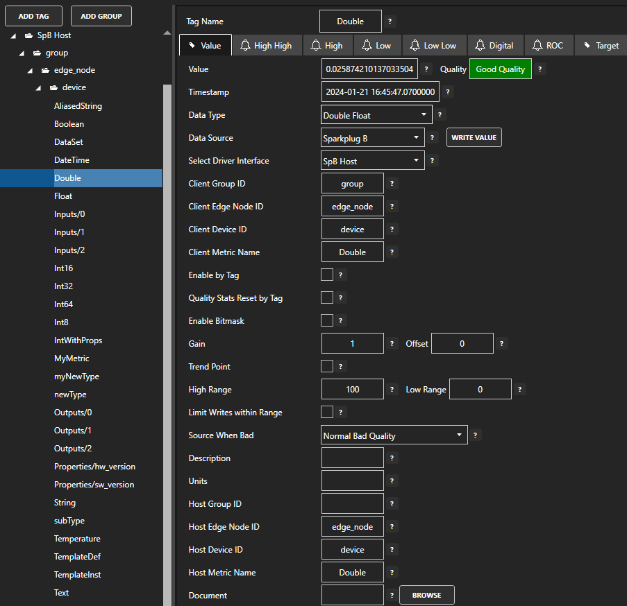 Change the Data Source Tag property to Sparkplug B.