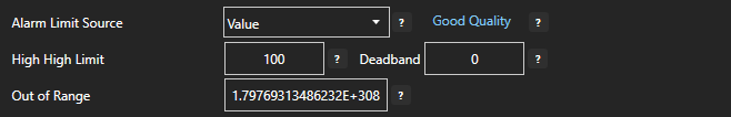 Use the Alarm Limit Source drop down to specify the source of the alarm limit. If value is selected, enter a numeric value in the High High Limit box below. Other options include another tag or a calculation. Setting a Deadband for the alarm limit specifies an amount that the value must be within the limit before the alarm condition is cleared. When the tag value goes above the Out of Range value the alarm limit is not evaluated and the alarm is disabled.
