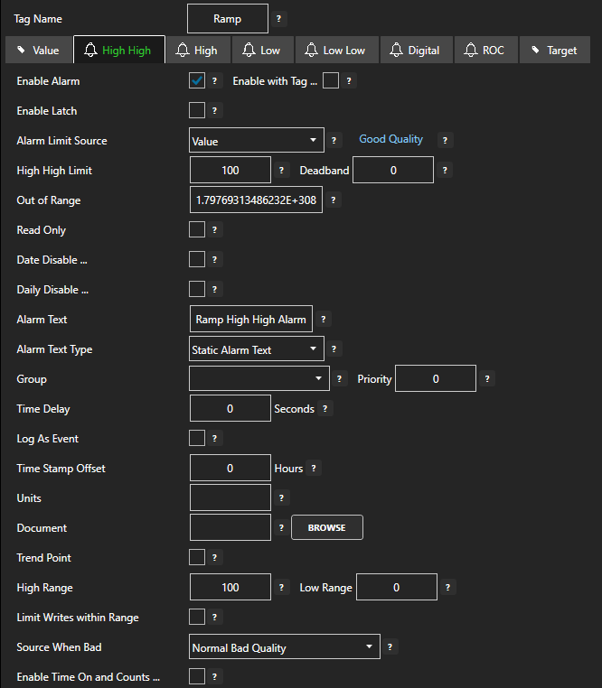 Each tag can have adjustable or fixed alarm limits for High High, High, Low, Low Low, Rate of Change, or Digital alarms.