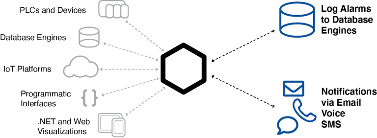 OAS supports a large library of Industry 4.0 data sources including Allen Bradley and Siemens PLCs, Modbus and MTConnect devices, OPC UA and DA Servers and Clients, Databases, applications, and more. Once connected, data from any source can be monitored, triggering Alarms for logging, notification, and visualization.