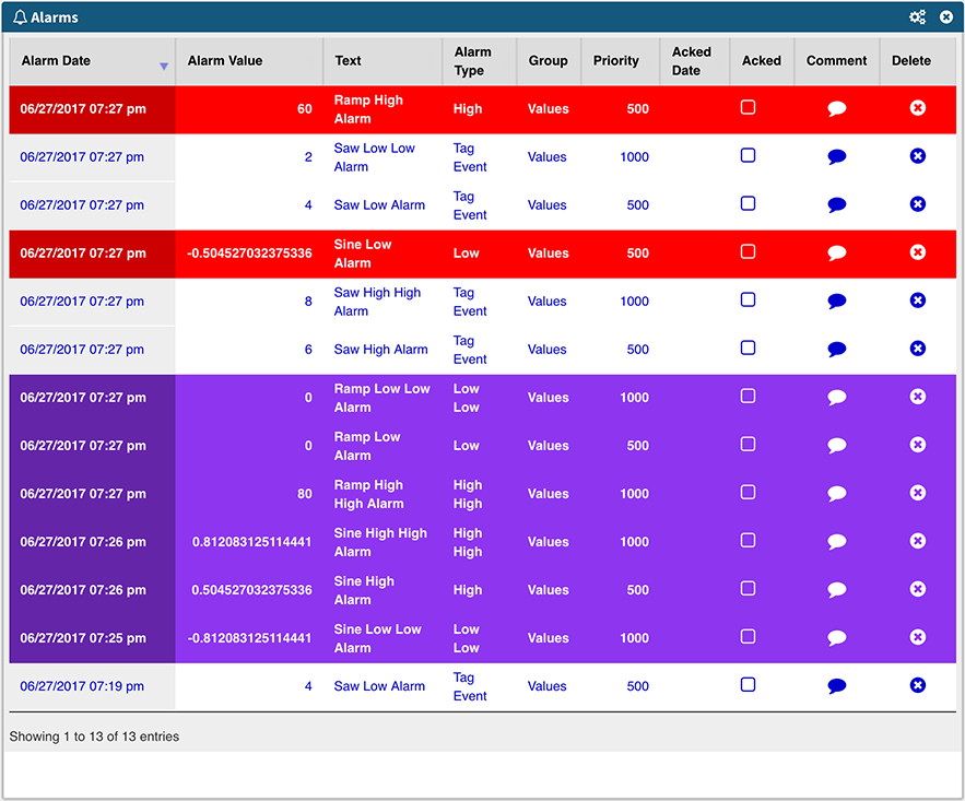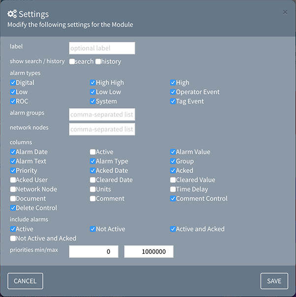 This module encapsulates the Web Alarm viewer and allows the end-user to configure it to display the columns desired. It also allows users to configure the viewer to filter alarms by type, group, status, and priority. Because it is based on the Web Alarm product, it retains all functionality. See the following for more information on Web Alarm.