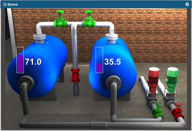 The Demo Module is an example of an interactive, visual representation of a physical system, with pumps, valves, and fluid level sensors. You can click or tap on each of the valves and pumps to simulate fluid flowing into or out of the two tanks. The corresponding tags in the OAS server can be found under the WPF/New Tanks Demo structure that is present in the demo tags included with each installation.