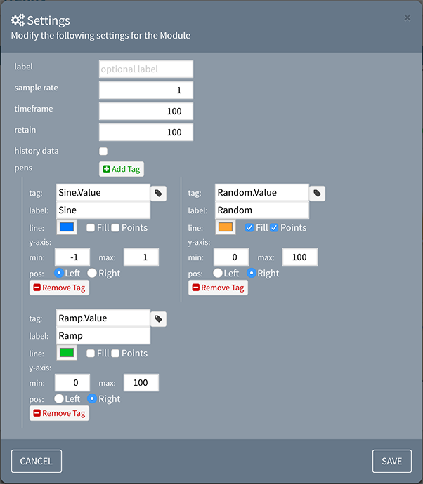 Pens: click Add Tag to add a pen linked to a server tag. Each tag will include settings for Name, Label, Line style, and Y-axis range and position