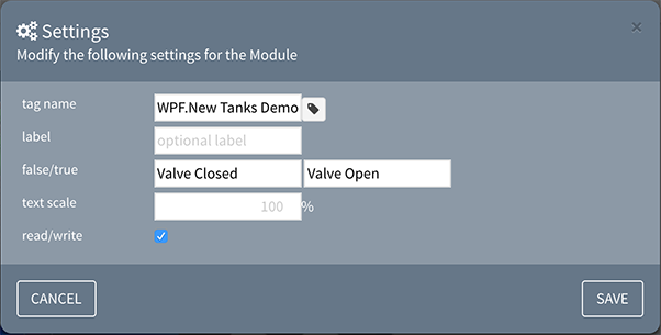 This module displays the current live value of a Boolean Tag. When configured to allow for read/write access, the display icon becomes a switch. If the switch is clicked or tapped, the server value will be toggled between True and False. The display can also be customized so that True and False text can be replaced with text of your choosing.
