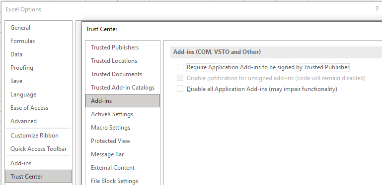 - Choose Options from the File menu. Choose Trust Center from the left menu, then click the Trust Center Settings button. Uncheck the top box for Require Application Add-ins to be signed by the Trusted Publisher.