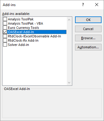 Select the Browse button and browse to the directory where you have placed the files to select OASExcel-AddIn.xll for 32 bit version of Excel or OASExcel-AddIn64.xll for 64 bit version of Excel and click OK.