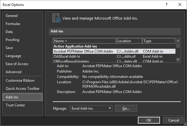 Select Add-ins in the lower left and then the Go… button to the right of Manage Excel Add-ins.