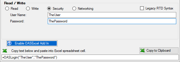 If the service you are connected to has Security enabled for reading or writing to tags you can specify the Security option in the OAS Excel tag browser and specify the User Name and Password for the Log In option.