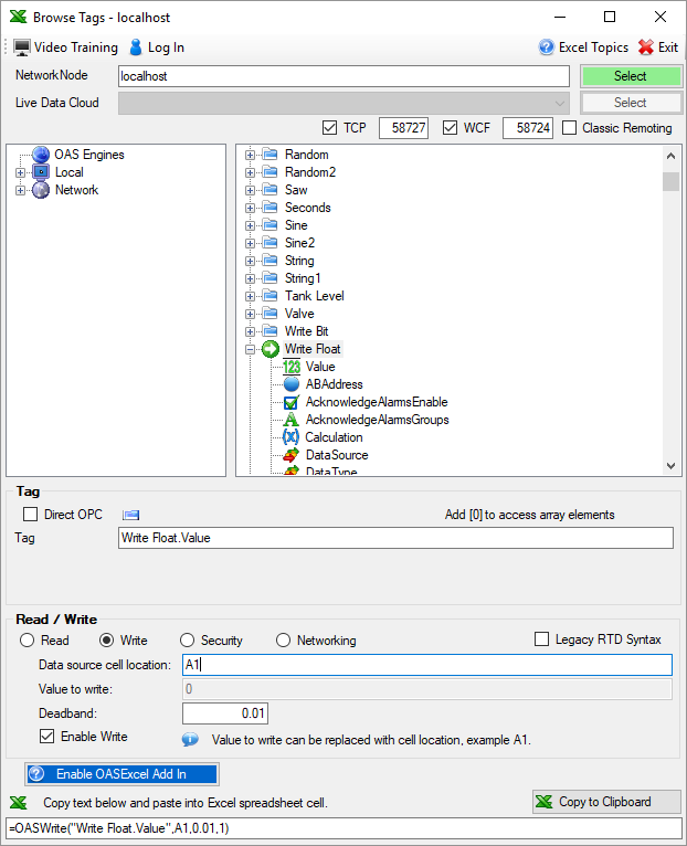 If you want to write to an OAS Tag go back to the OAS Excel Tag browse application and select the local or remote tag you want to write to and select the Write radio button. Enter either a fixed value in the Value to write field or enter a Cell location in the Data source cell location field. In this example we will write the value from cell A1 to the tag Write Float.Value.