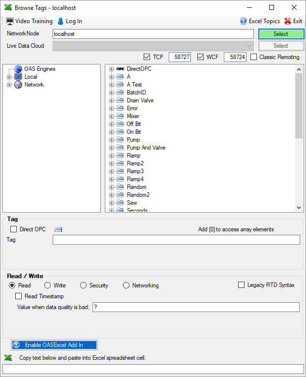 Use the OAS Excel Tag browse application to define read formulas to local and remote OAS Tags.