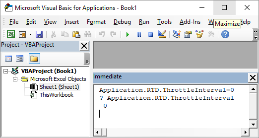 ? Application.RTD.ThrottleInterval - Make sure your cursor is at the end of this line and then press ENTER. The window should display 0; then you know that your throttle interval is set correctly.