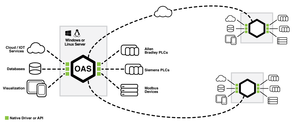 The OAS Platform ships with built-in native drivers for many devices such as Allen Bradley, Siemens, and Modbus PLCs. Connectivity can be configured using the OAS Configuration tool, exposing real time data and control to the Platform. Once connected, each device’s data can be shared over any network between other installations of the OAS Platform, providing a great deal of flexibility in deployment and data aggregation.