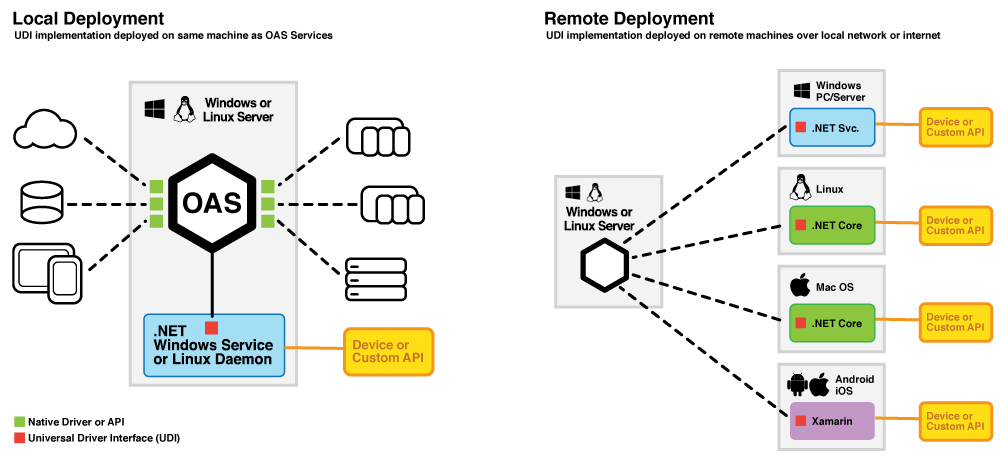 Additionally, the UDI implementation can be deployed either on the same machine as the OAS Server if written as a Windows Service, or it can be deployed remotely on another Windows PC or server. If the UDI implementation is written as a .NET Core application, it can be deployed as a Mac or Linux application and installed as a persistent background process. If desired, a UDI implementation can also be written using Xamarin and deployed as an Android or iOS application.