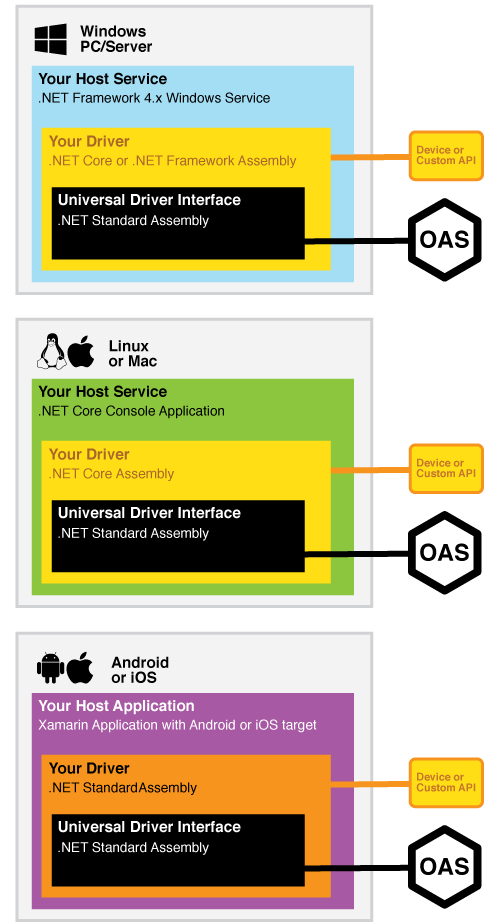 The Universal Driver Interface is built upon the .NET Standard 2.0 Framework, allowing it to be deployed and run on Windows, Mac, Linux, Android, iOS, and even Raspberry Pi* platforms. This opens up unlimited integration scenarios for the OAS Platform, allowing for new edge computing solutions and device connectivity.