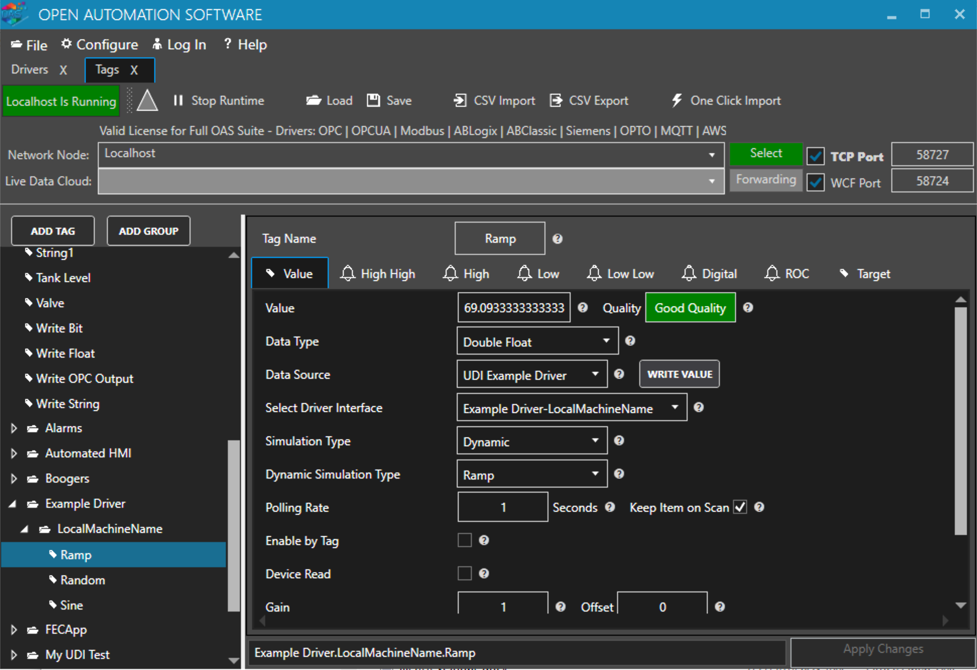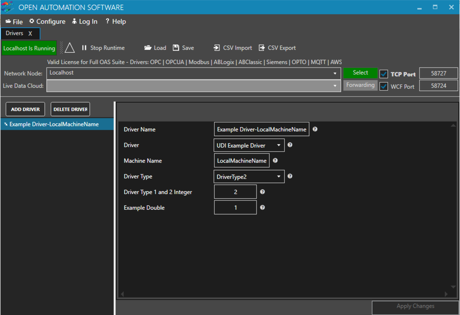Open OAS Configuration to Configure Drivers and Tags. Within the OAS installation directory, you can find the OAS Configuration.exe application. Execute this application and when the window opens select Configure > Drivers. Then click Select next to the field containing “Localhost“. You should see your new ExampleDriver listed to the left. Select it and you should see the following screen: