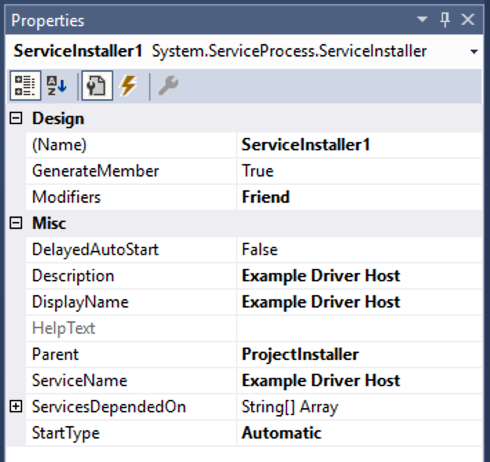 Within the Visual Studio Solution Explorer, click on the ProjectInstaller(.vb or .cs) and you should see a “Designer” that displays a reference to ServiceInstaller1. Click on ServiceInstaller1 and in the properties pane you should see the settings pictured here.