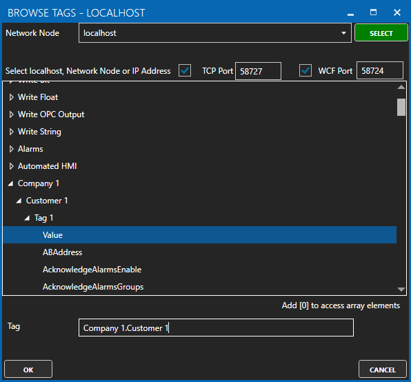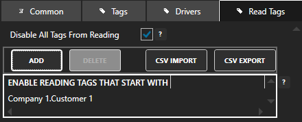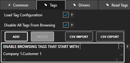 Select ADD in the list to Enable Reading Tags that Start With to browse for a tag within the Company 1.Customer 1 group and remove the tag portion of the string and select OK.