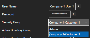 Use the Security Group pull down to select the security group you have defined for the Company 1.Customer 1 group.