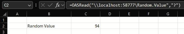 Microsoft Excel can be used together with the OAS Excel feature to read and write OAS tag data. If you only specify the tag page, the OASRead function will use localhost and port 58727 as the default connection parameters. However, you can override this by specifying a full tag page with the IP or host name as well as the port number to connect to. In the following example, the tag is being read from localhost but using port number 58777.