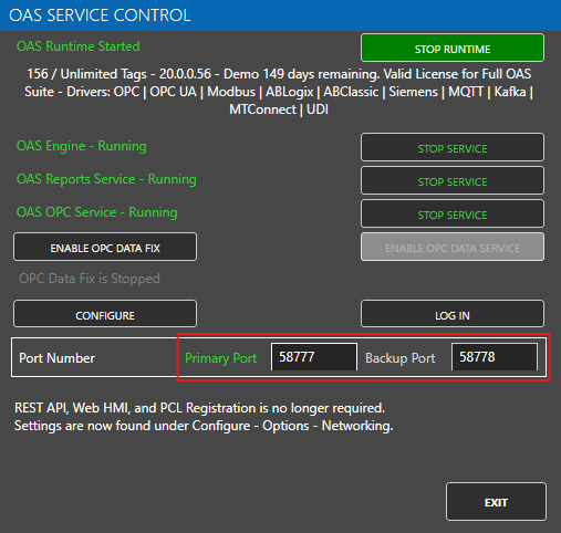 Technically only one of the two ports needs to be correctly set and a green text color will indicate which port is being used, but it is best to make sure both ports are correctly set. In the image above, the Primary Port 58777 is currently being used by the OAS Service Control tool. The main purpose of the backup port is to allow you to recover the OAS connection in case the primary port is no longer available, has been blocked or has become unresponsive.