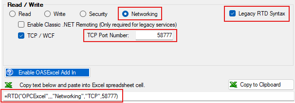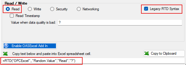 You can also use the legacy RTD method to read and write OAS tag data. This method is supported on OAS version 17 or lower. To use this method you will need to specify a cell in Excel that uses the “Networking” parameter and also the “Read” parameter for reading.