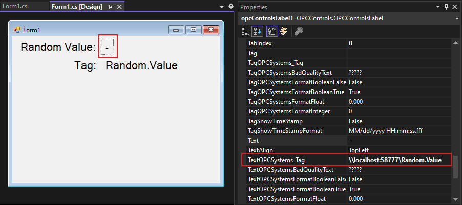 - Select the control where you want to set the Tag value. Let’s say an OPCControlsLabel.