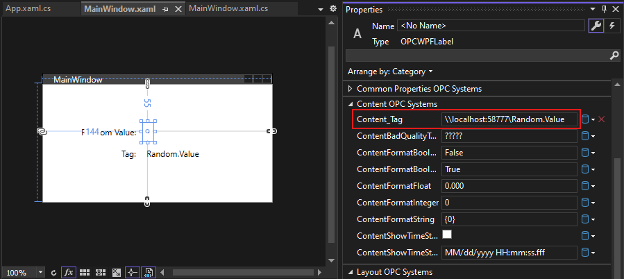 - Select the control where you want to set the Tag value. Let’s say an OPCWPFLabel.
