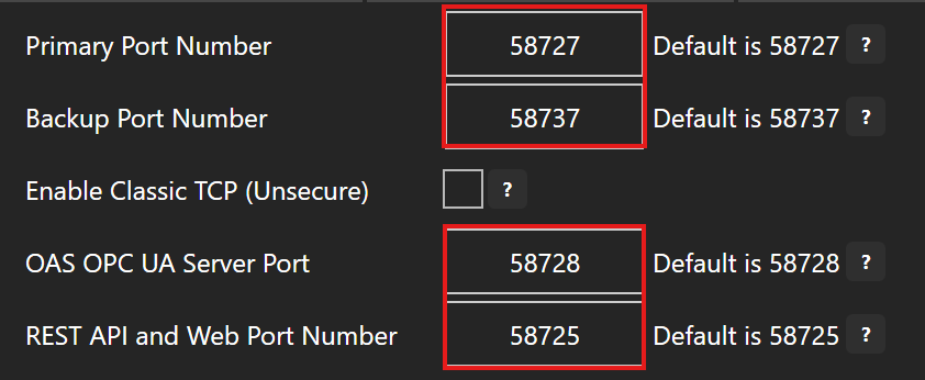 The default TCP port number for .NET applications, Microsoft Excel, OPCSystems.NET OPC Server, the OAS Configuration tool and service to service communications is 58727. The default web port for web applications and the REST API (which includes UIEngine) is 58725.
