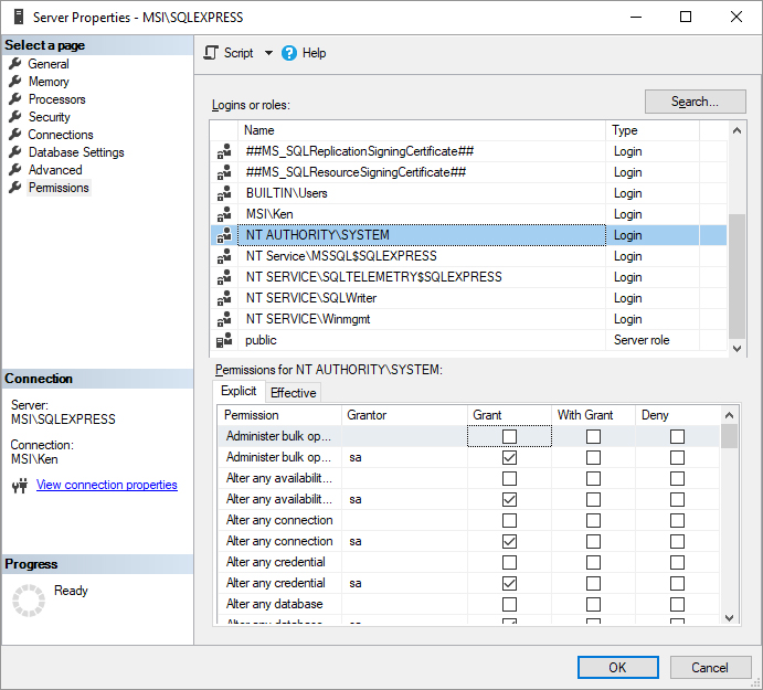 For Windows Authentication Login open the PC account that the OAS Database Service is running on this would be NT AUTHORITY\SYSTEM for the local system. For SQL Server Login either add a new account or select an existing account where you know the password. For SQL Server login make sure the property to Enforce password expiration is disabled: Database Security Login 3