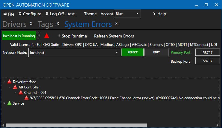 Select Configure-System Errors and expand any Modbus or Driver Interface error to see the details of the error.