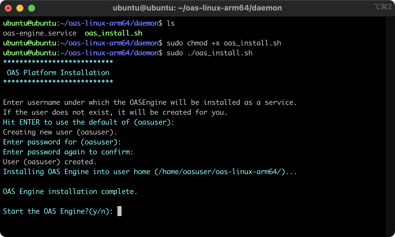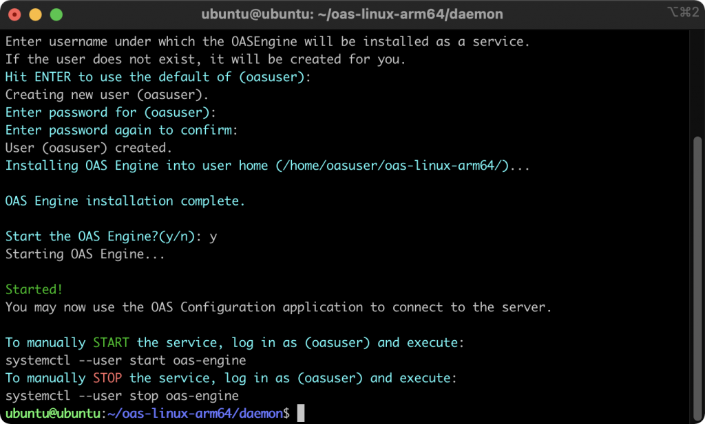 The OASEngine is now installed as a user service or daemon under the account selected or created (default: oasuser). This service is managed by systemd and can be controlled or monitored like any systemd service. By default, the OASEngine is now configured to start up when the machine reboots.