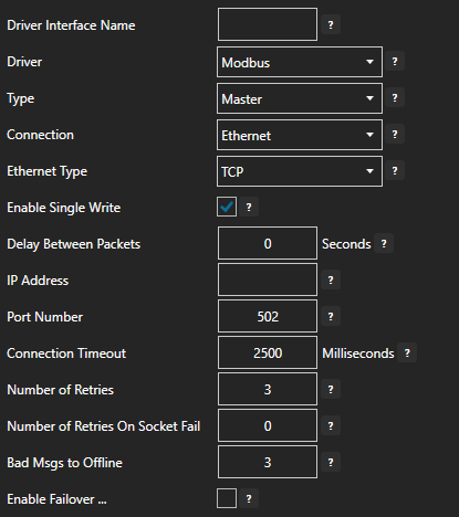 - Enter a meaningful Driver Interface Name that you will refer to this physical connection when defining Tags with a Modbus Data Source.